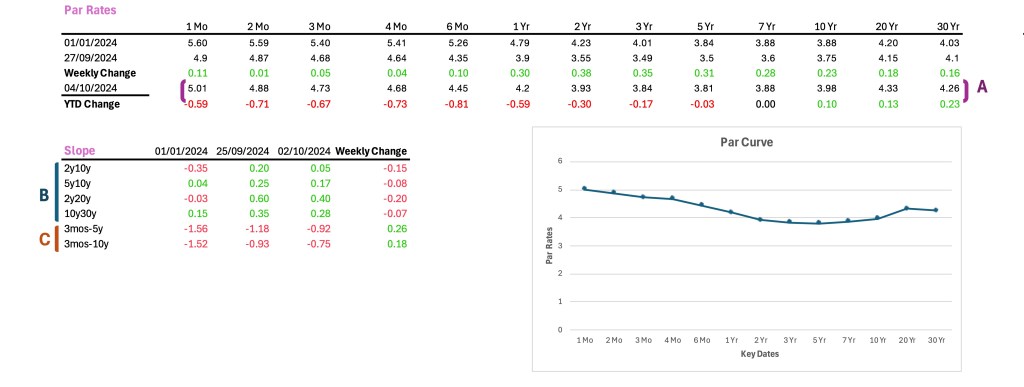 The methodology will commence with a thorough examination of the figure presented below. The initial table offers the par rates corresponding to each key date. It includes par rates from the beginning of the year, the rates recorded from the previous week, and those observed today (A). Additionally, two rows have been included to denote the weekly changes for each rate and the year-to-date changes pertaining to these par rates.
