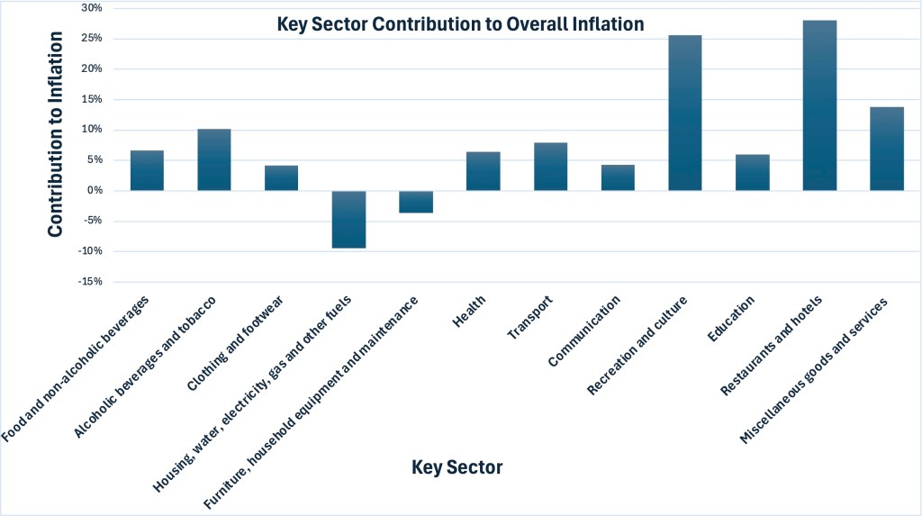 We shall also construct a bar chart illustrating the relative contributions of key sectors (e.g., energy, food, services, etc.) to overall inflation and analyse which components are influencing inflation either upwards or downwards.