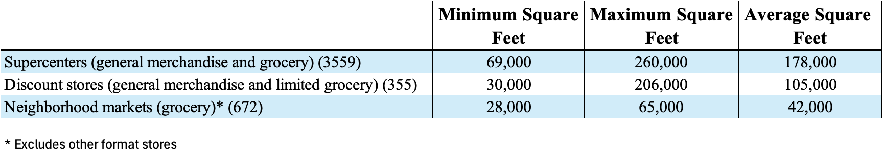 Walmart U.S. provides an omnichannel experience to customers, integrating retail stores and eCommerce. The following table provides the approximate size of the retail stores as of January 31, 2024: